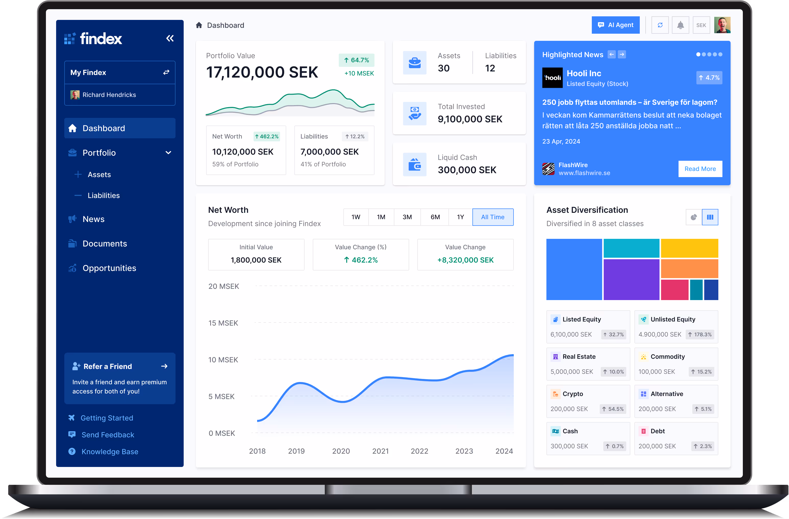Track, optimize, and grow your net worth in a modern private banking platform, powered by AI. Get insights, make data-driven decisions, and gain access to capital opportunities.